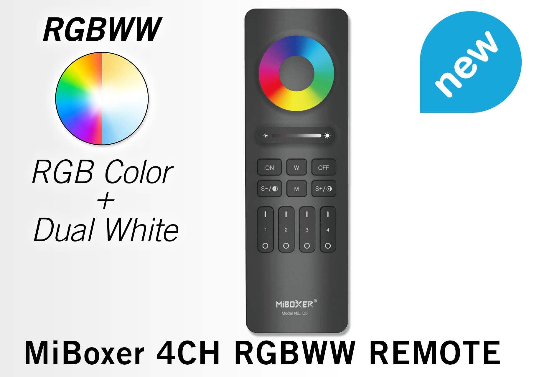 Deze nieuwste Miboxer versie beschikt over 4 unieke zones waaraan u een ongelimiteerd aantal RGBWW verlichting kan koppelen, zoals de nieuwe 9W RGB+CCT lamp en de 6Watt en 12Watt inbouwspots. Deze bediening is uitgebreid met nieuwe functies zoals de kleurverzadiging (saturatie) instellen voor pasteltinten te verkrijgen alsook een extra schuif om de Dual White functie in te regelen van koel naar neutraal tot warm wit.