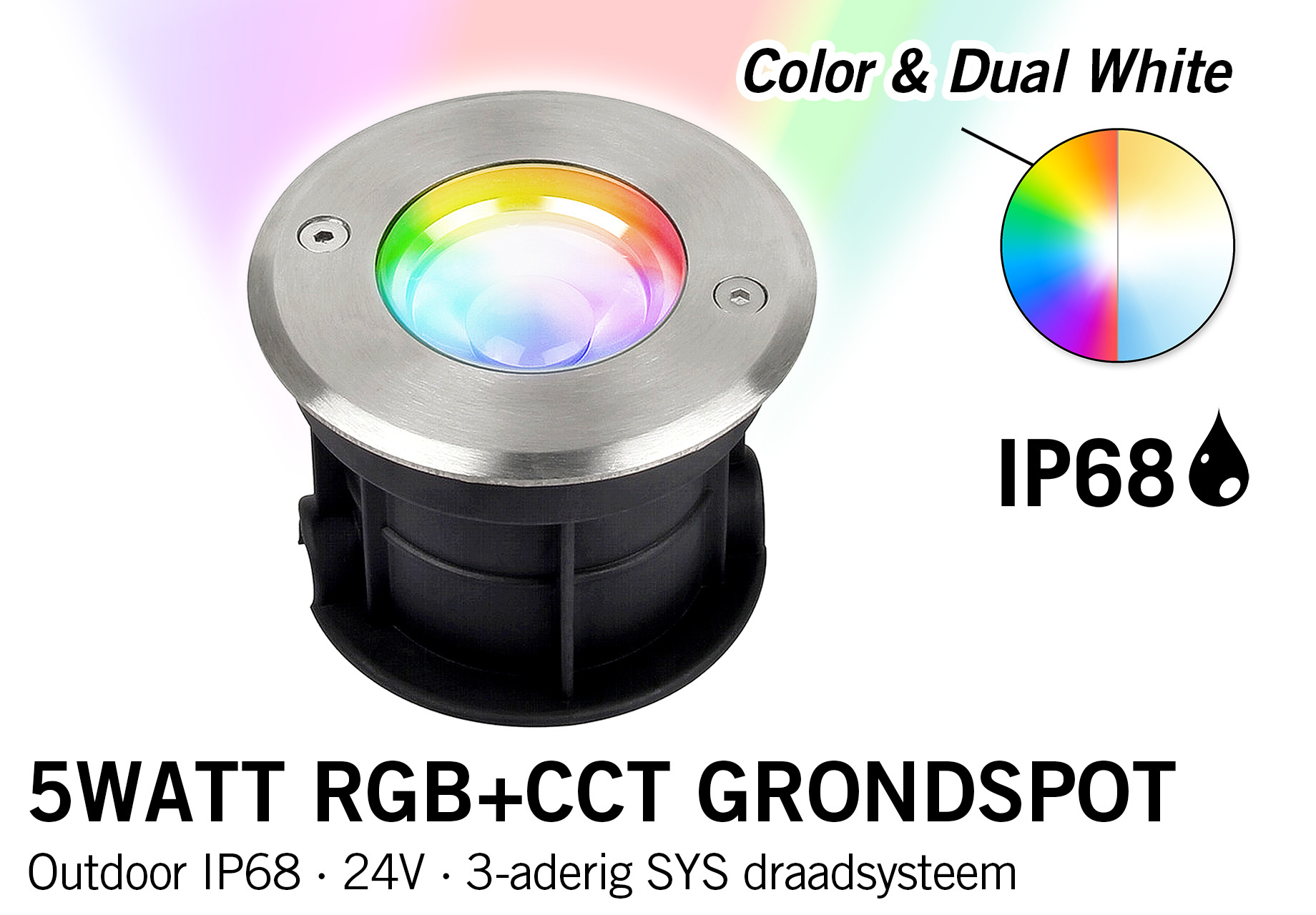 Deze Grondspot met 5 Watt lichtvermogen en de kleurstandaard RGBWW of RGB+CCT beschikt over alle kleuren inclusief Dual White (2700K-6500K). De kleuren en het witte licht kunnen bovendien gemengd en gedimd worden.