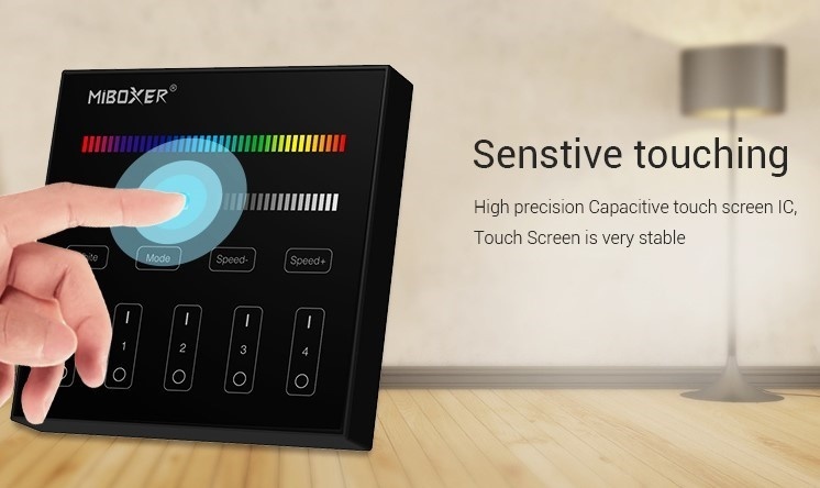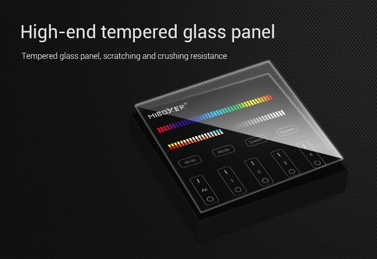 De Zwarte Mi-Light draadloze opbouw wandbediening met 4 bedieningsgroepen. Werkt op twee AAA batterijen en is de wandbediening is zodoenden overal eenvoudig te installeren op een wand. Dit fraaie touch paneel is toe te passen als RF afstandsbediening van alle RGB+Dual White of RGBW Kleur+Wit AppLamp en Mi-Light LED controllers, LED lampen en RGBW spots.